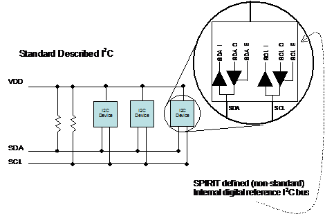 The I2C "eye-squared-see" bus is a two-wire bus with a clock and data line. The standard described bus is the two-wire bus. Spirit has defined an additional, related bus which is the internal digital interface. This reference BusSpec contains three pins for each external pin: for SDA (the data line) the internal pins are defined as input, output, and enable as SDA_I, SDA_O, and SDA_E, in a similar manner for the clock bus: SCL the internal pins are defined again for the functions of input, output, and enable as SCL_I, SCL_O, and SCL_E